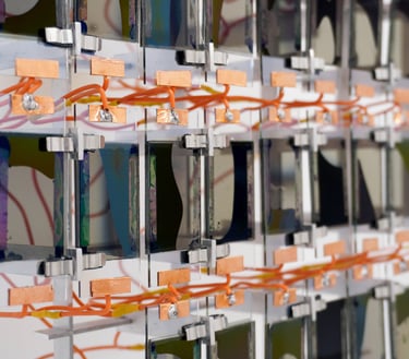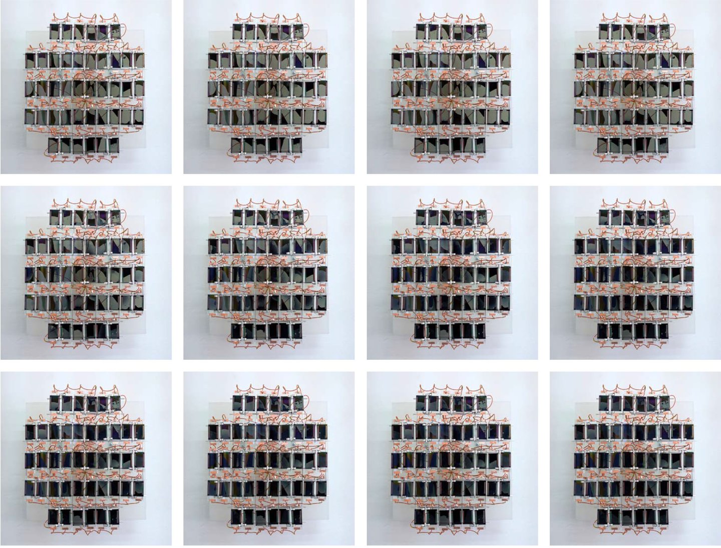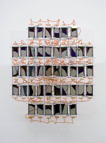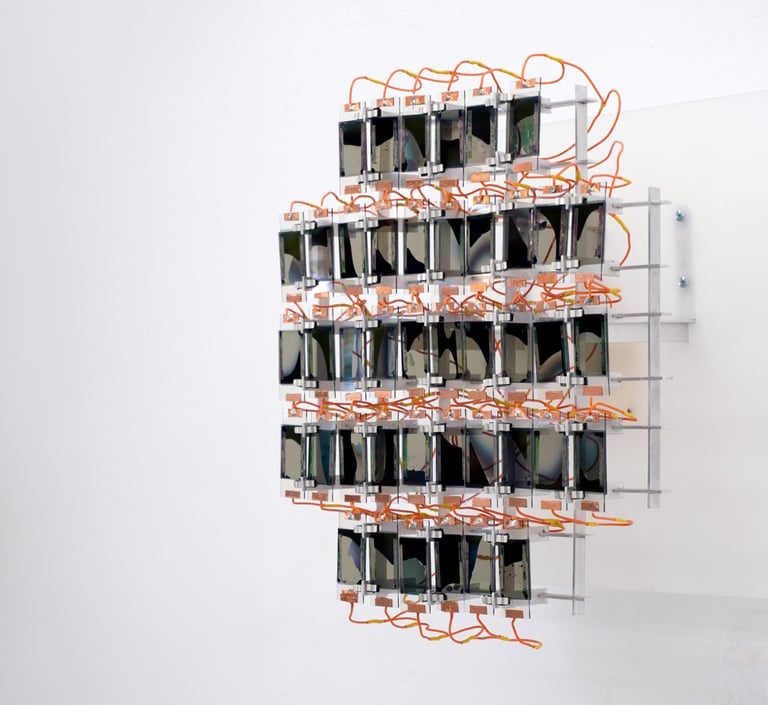 By hand-making liquid crystal (LCD) pixels to create sculptural screens, the artwork reveals a rare beauty in the fleeting exchange of energy, light and shadow at the foundation of the digital aesthetic. Undertaking a would-be mechanised fabrication process to make hundreds of liquid crystal pixels by hand, the artwork highlights the elaborated manufacturing processes and excessive labour required to produce technological devices that will eventually be discarded.