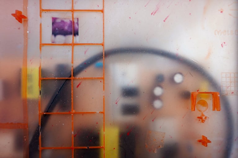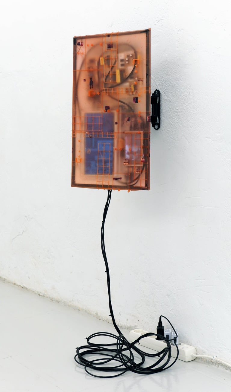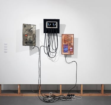 Reclaimed LCD TV, latex, powerboard, computers, cables, screens, photos and two-channel video.