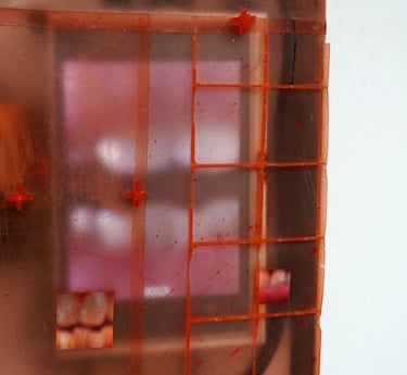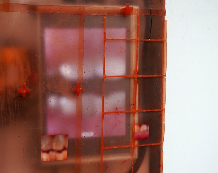 Cast from television components, the latex skin includes impressions from the TV manufacturing process, creating a cell-like aesthetic that melds body and technology, and engages themes of corporeality, contemporary media and renewal.