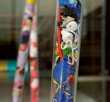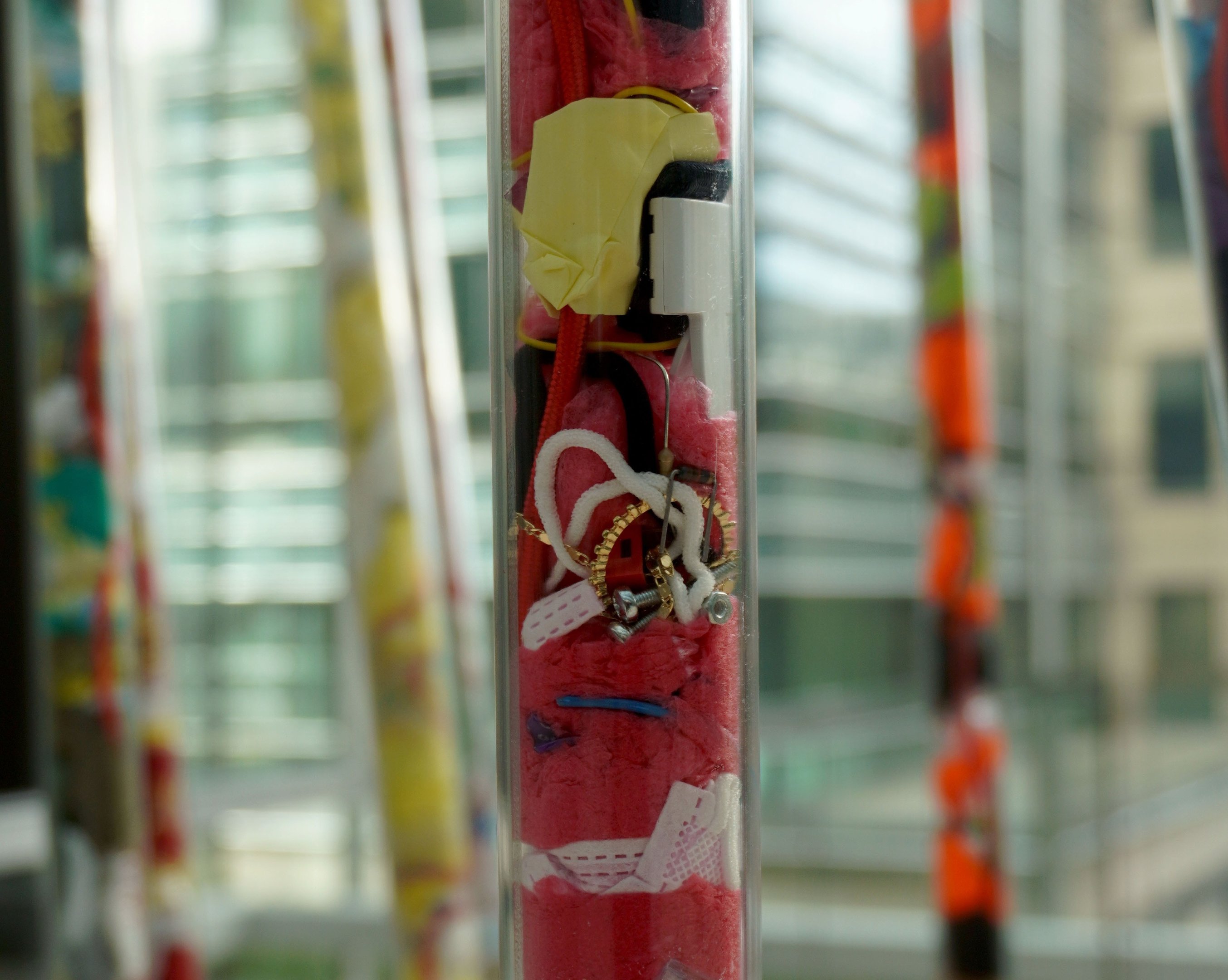 Even as waste, the salvaged mobile phones continue to perform, communicating messages from nobody to no one. Inspired by the workers on mobile phone production lines, the sculpture documents the variety of redundant objects and personal belongings that are part of the manufacturing process but not present in the final product. From blue latex gloves, pink hair nets and polyurethane sacks to commuter train tickets, fake nails and high-vis jackets, these redundant items record the people and places intertwined with the continuous cycle of manufacture and consumption.