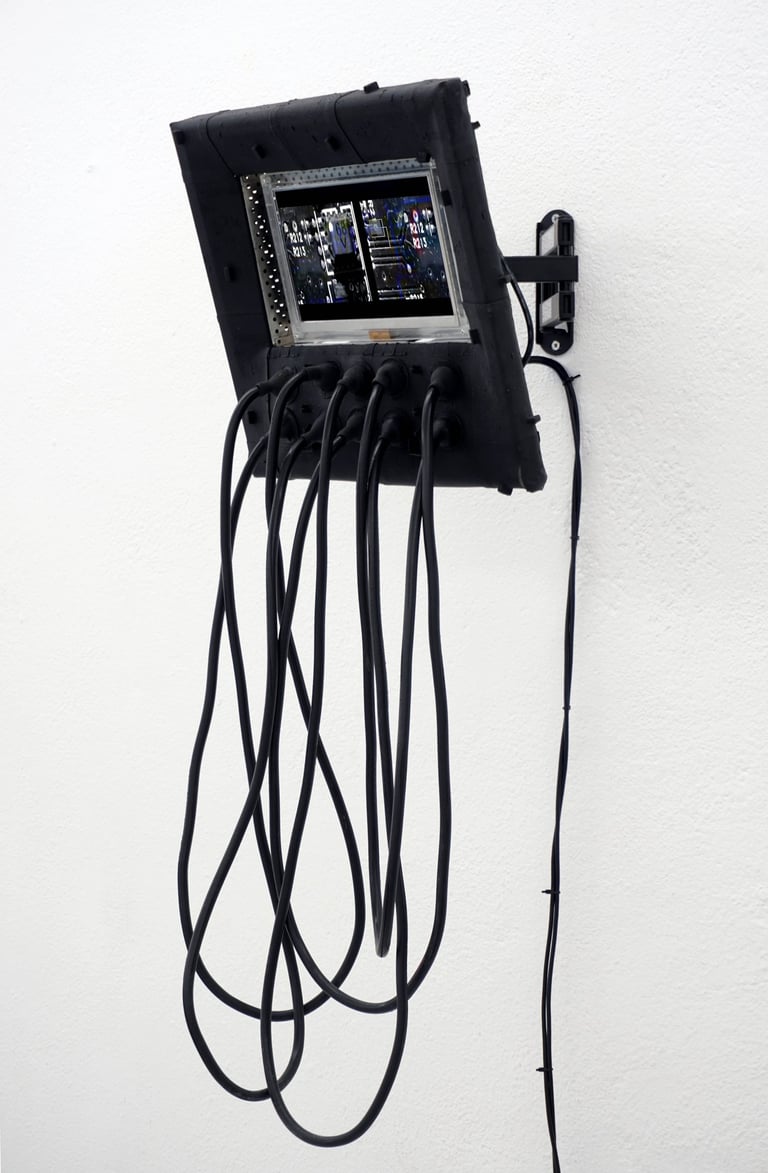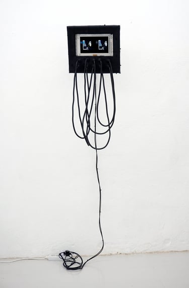 Reclaimed LCD TV, latex, micro computer, cables, LCD screen, single-channel video